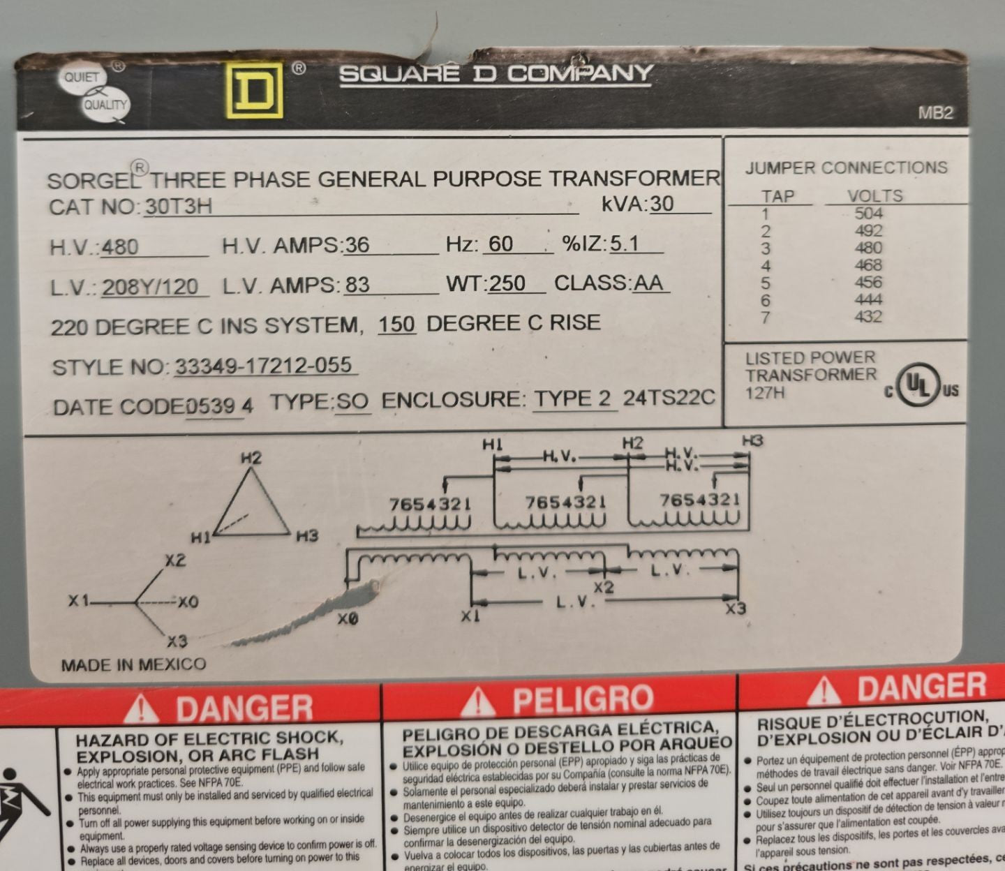 30kVA Square D 30T3H Sorgel Transformer 3PH Pri 480V Sec 208/120V Indoor T269 Used
