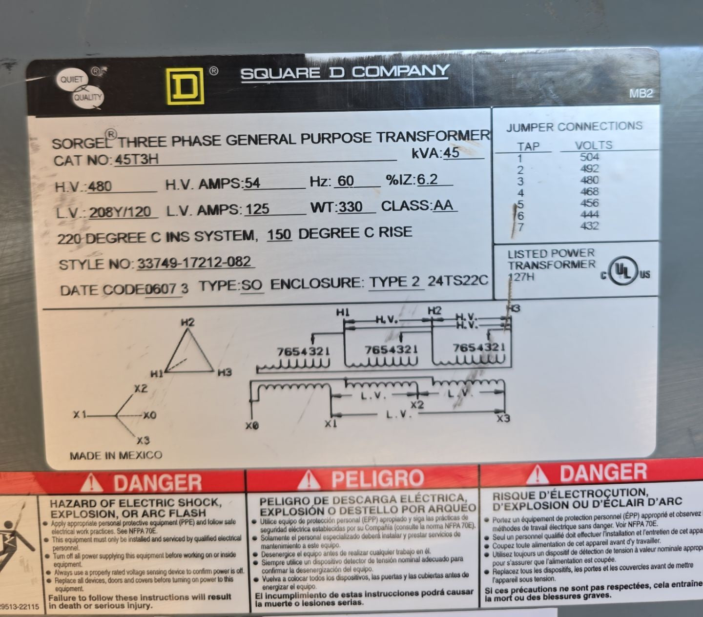 45kVA Square D 45T3H Sorgel Transformer 3PH Pri 480V Sec 208/120V T263