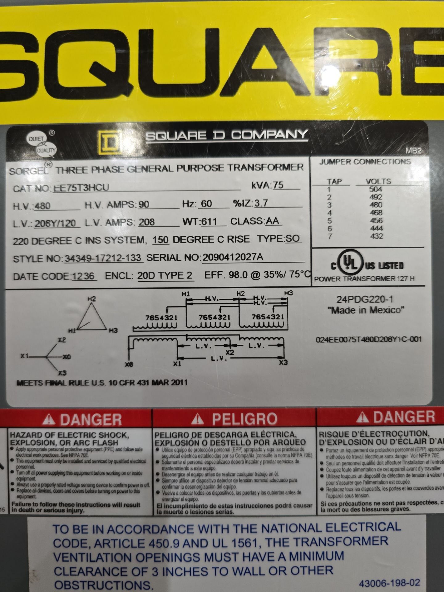 75KVA Square D EE75T3HCU Transformer Pri 480V Sec 208/120V 3PH Indoor Encl New New