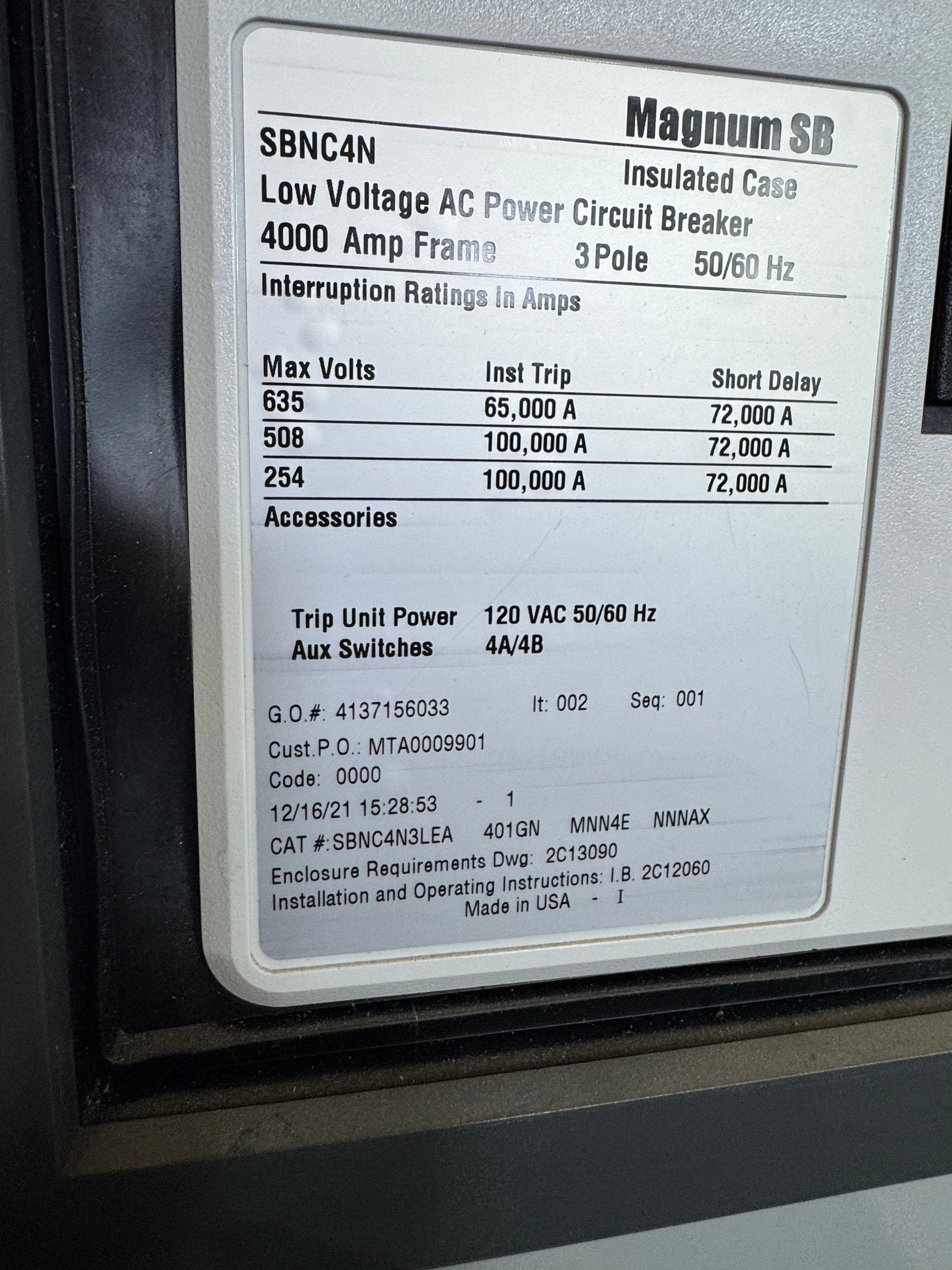 Eaton SBNC4N3LEA Circuit Breaker 4000A 3P 600V 11ARMLSIG DigiTrip 1150+ SBNC4N