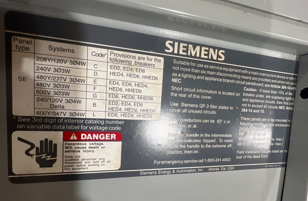 Siemens SEE42ML400CTS SE Panelboard 400A 480Y/277V 3PH 4W 42 Circuit MLO SBD68 P271 Used
