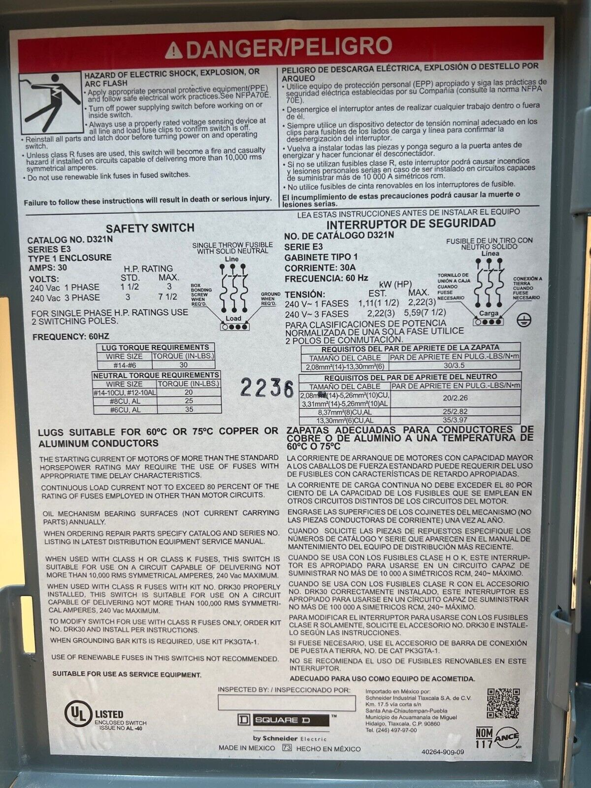 SQD D321N Safety Disconnect Switch 30A 3P 240V Indoor Encl