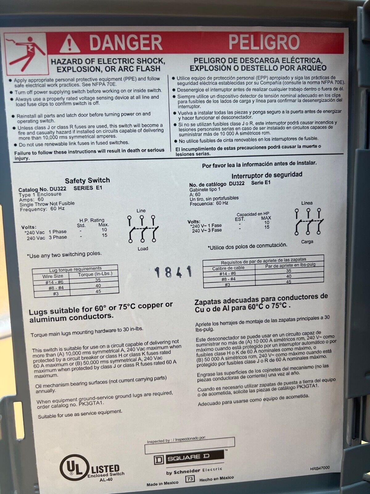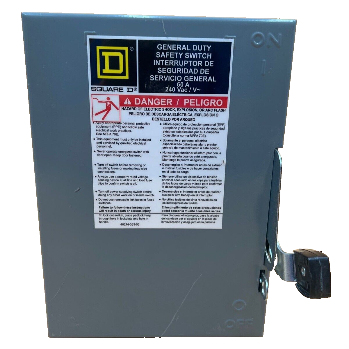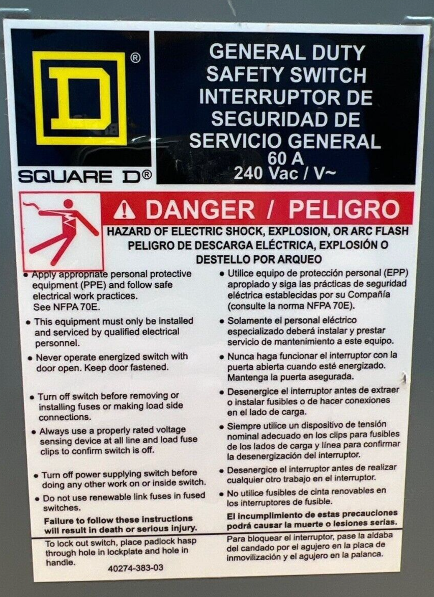SQD DU322 Safety Disconnect Switch 60A 3P 240V Type 1 Enclosure