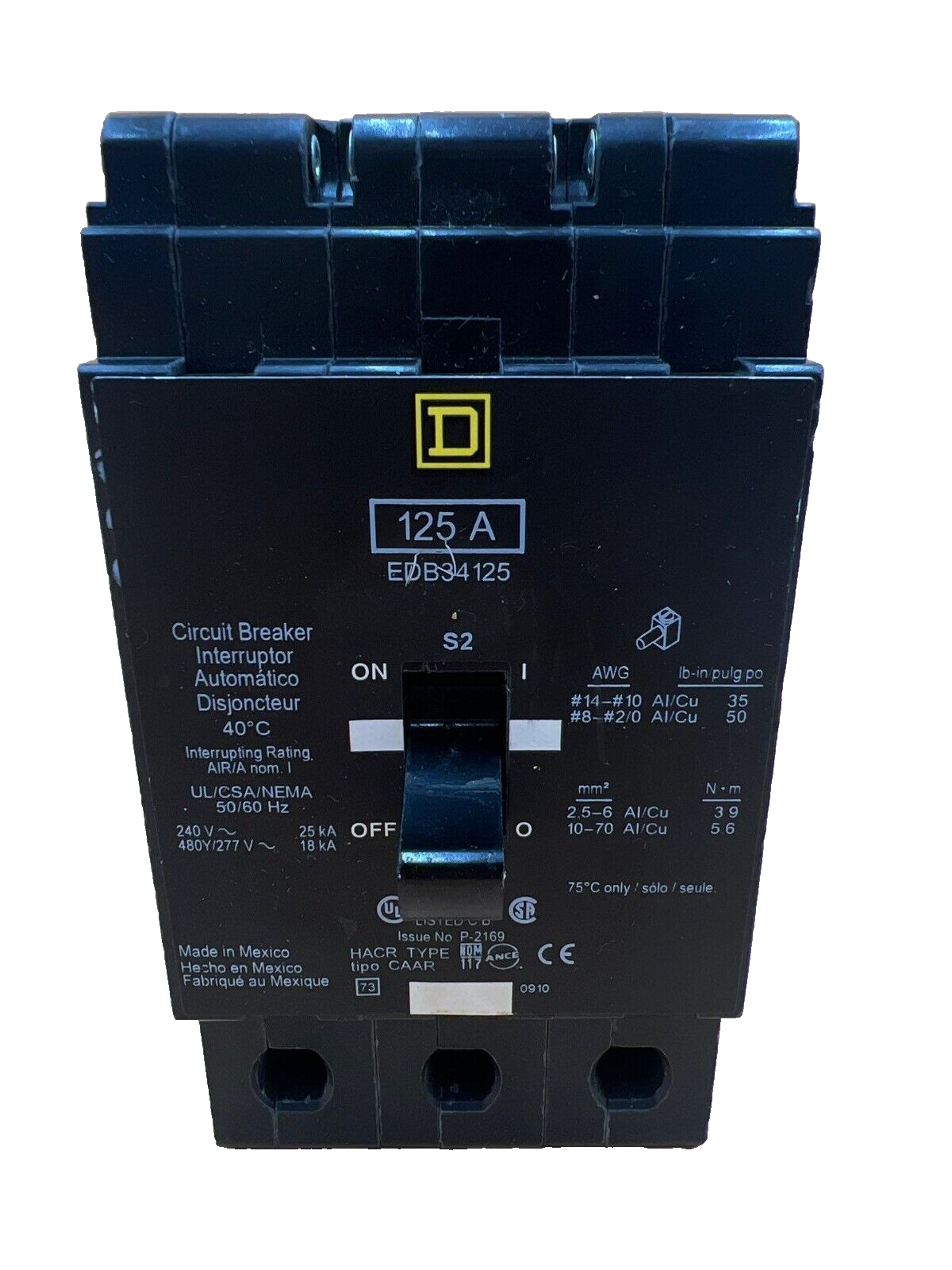 Square D EDB34125 Bolt On Circuit Breaker 125A 3P 480V 3 Pole 125 Amp