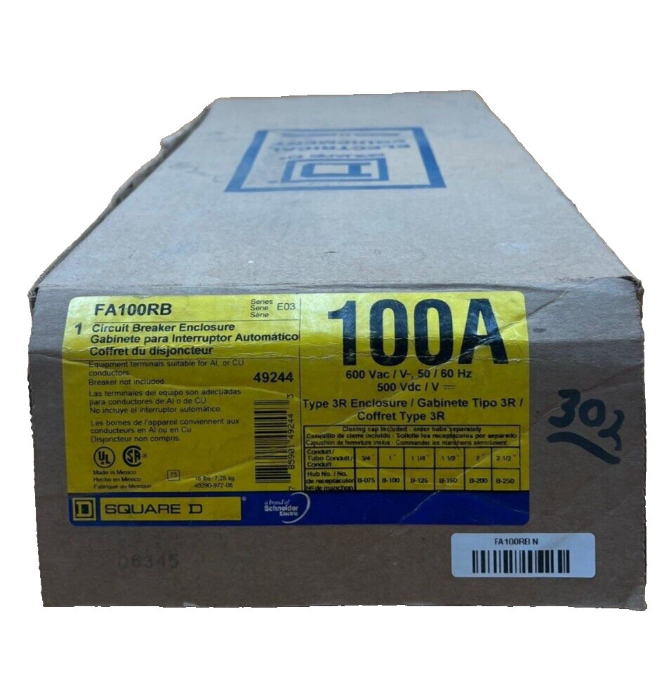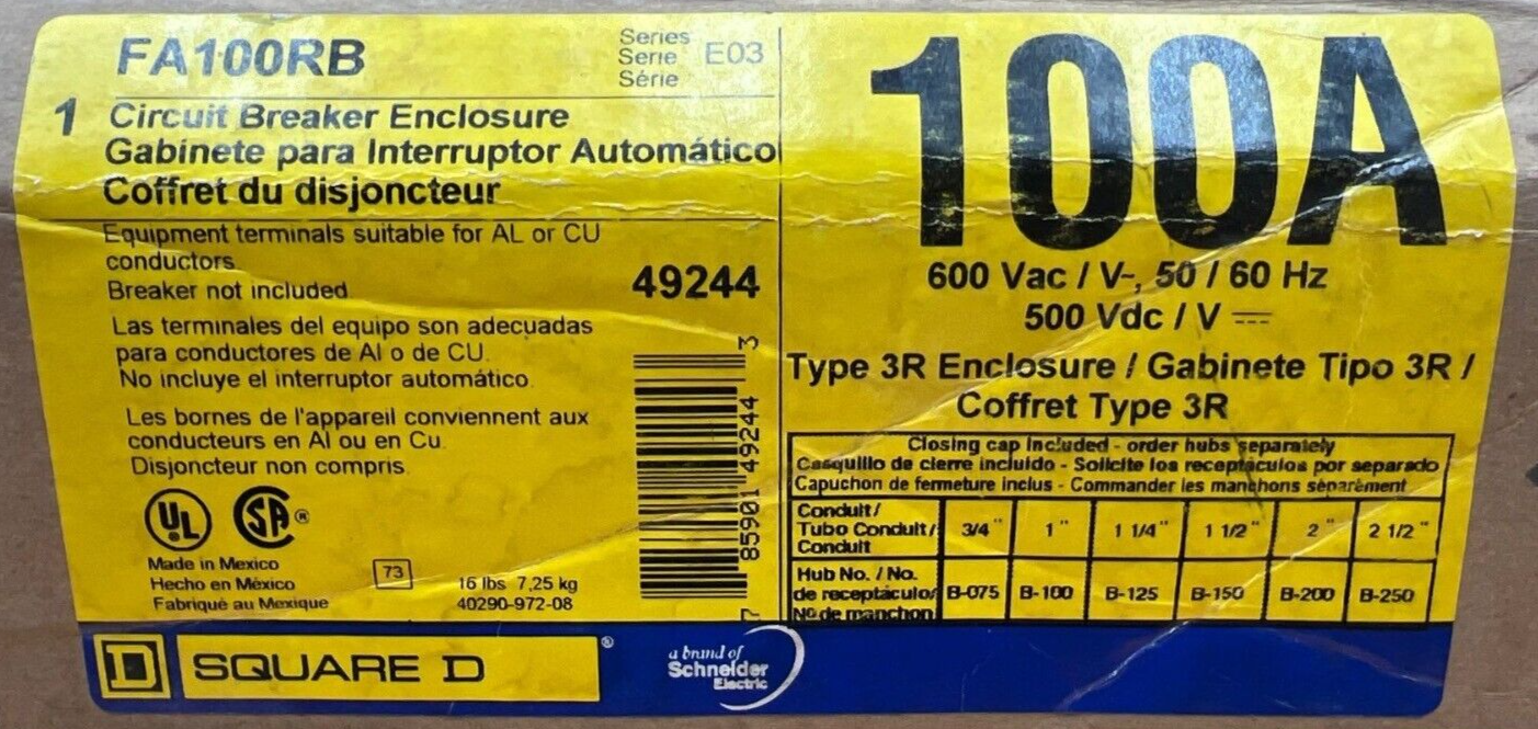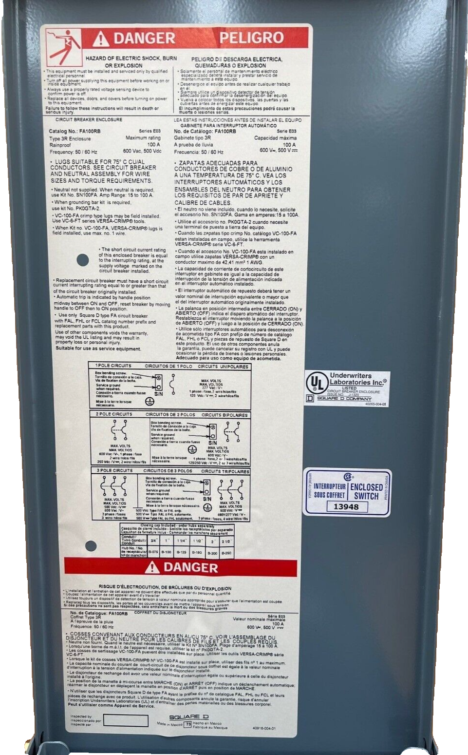 SQD FA100RB Safety Disconnect Switch 100A 3P 600V 3R Outdoor Enclosure