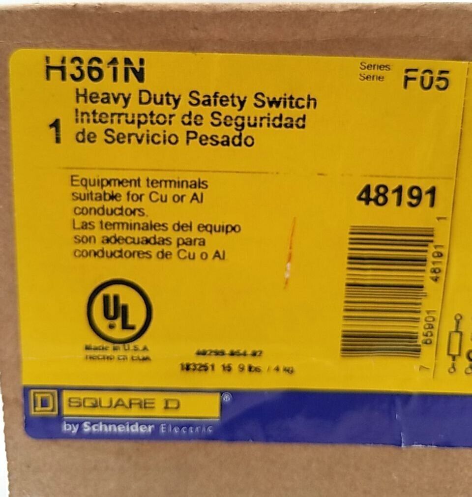 Square D H361N Safety Disconnect Switch 30A 3P 600V 3PH Type 1 Enclosure Indoor