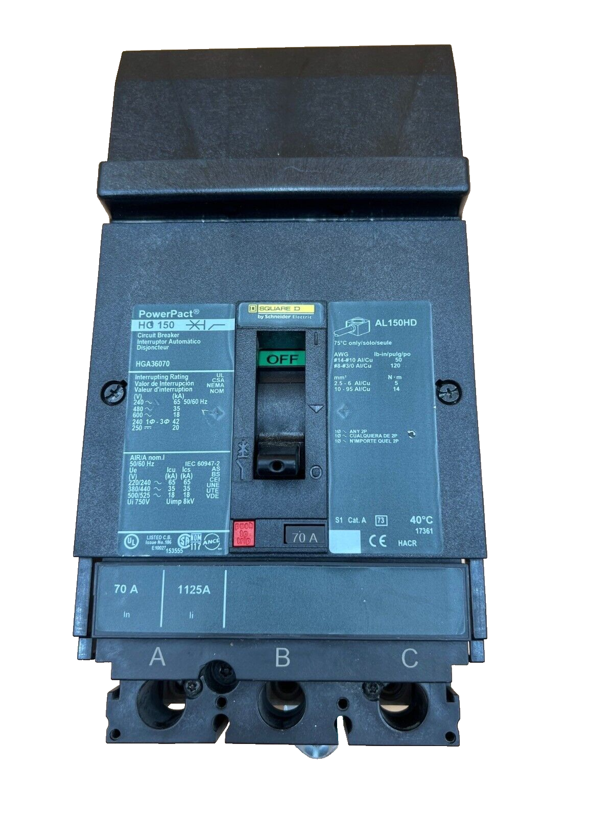 SQD HGA36070 Circuit Breaker 70A 3P 600V 3PH I-Line 70 Amp 600 Volt
