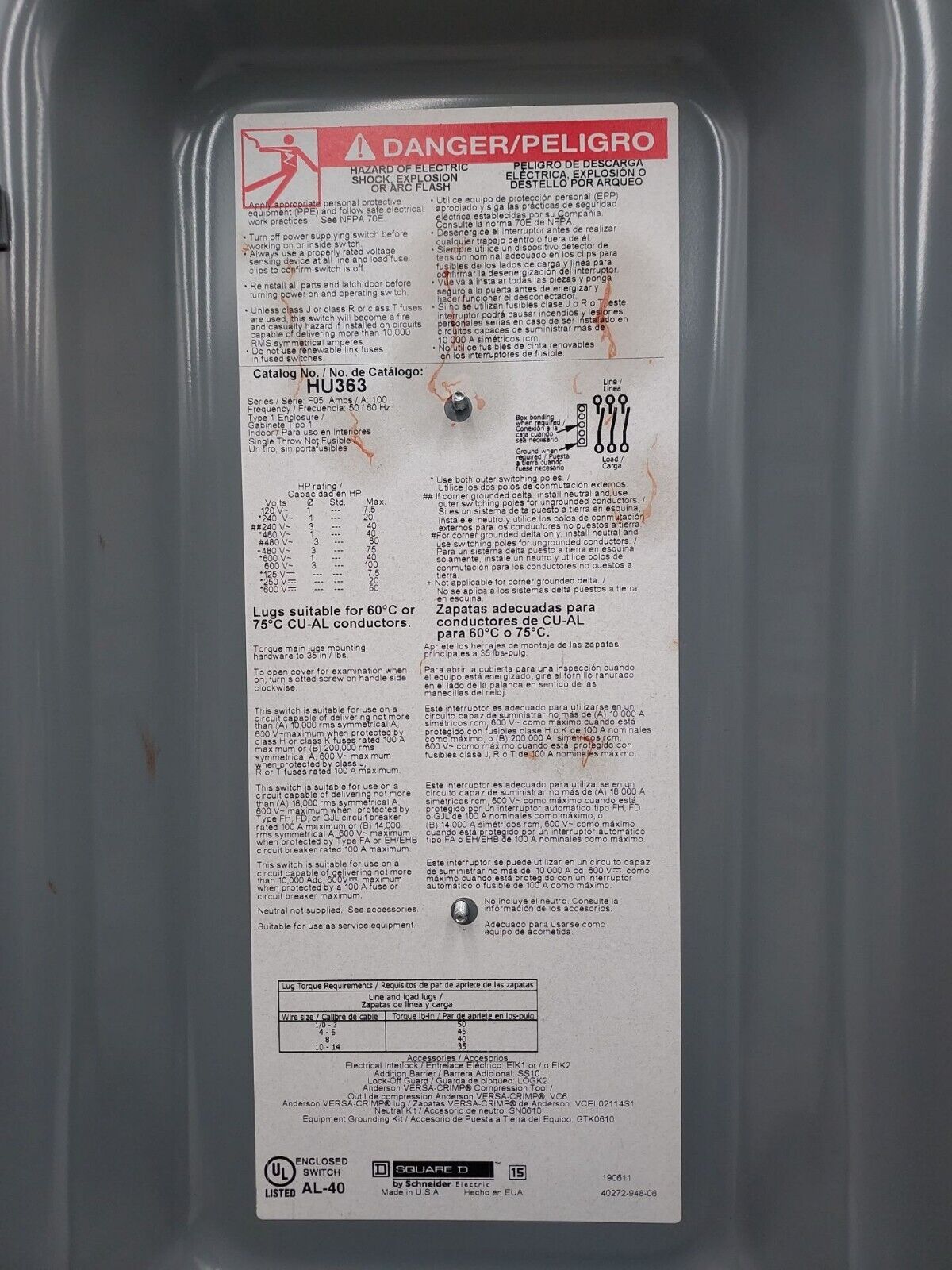 Square D HU363, 100 Amp, 600 Vac, NEMA 1, Heavy Duty Safety Switch,