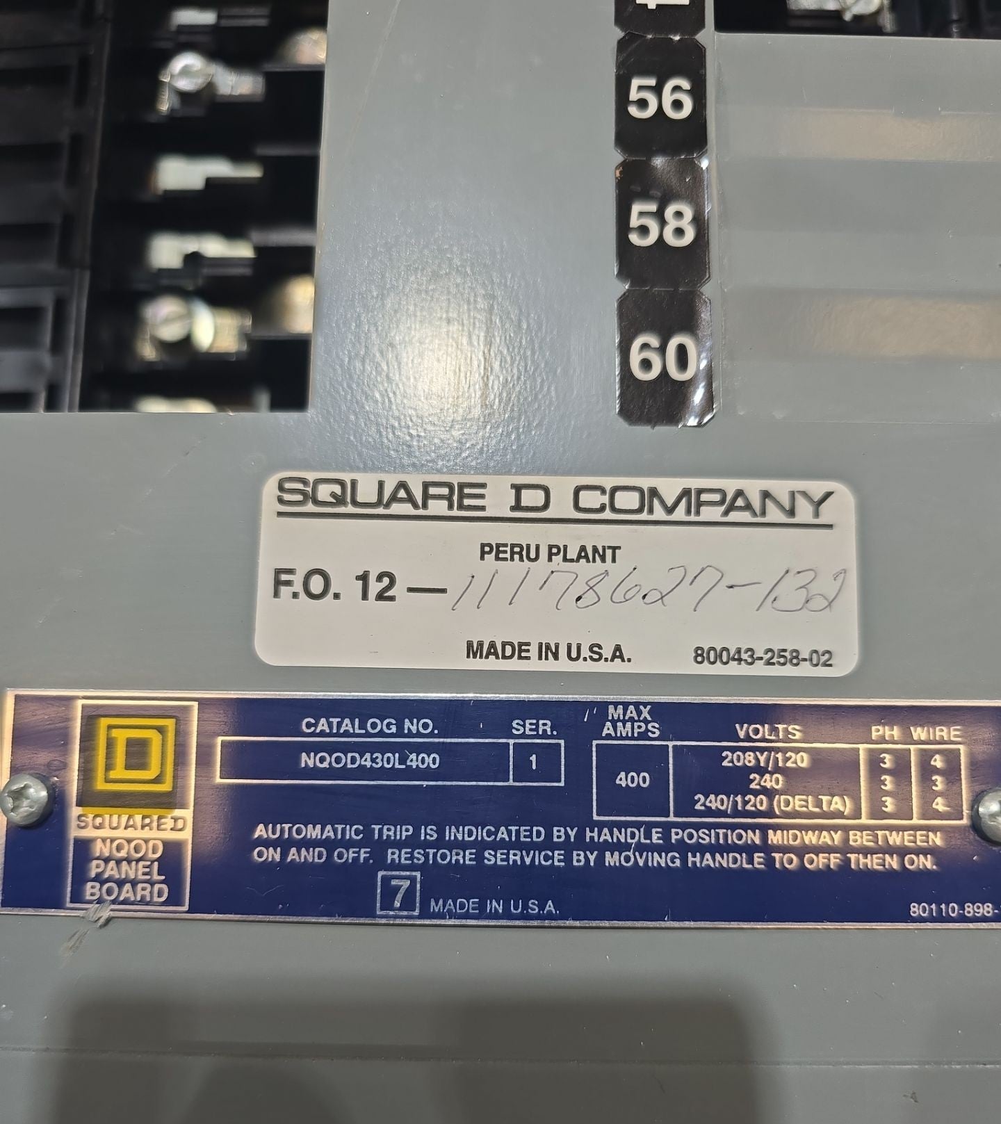 Square D NQOD430L400 Panelboard 400 Amp 208/120V 30 Cir 3PH 4W MLO Panel 400A