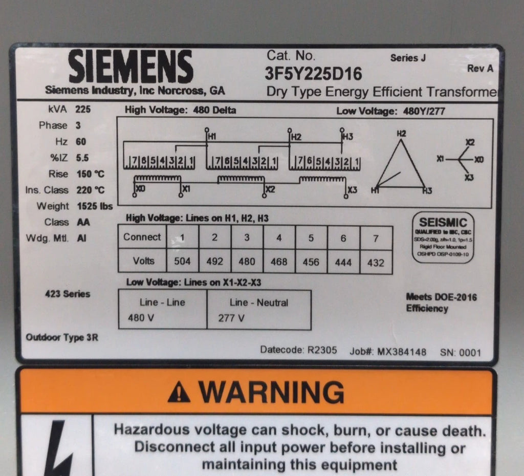 225KVA Siemens 3F5Y225D16 Transformer Pri 480V Sec 480/277V 3PH Outdoor 3R Encl