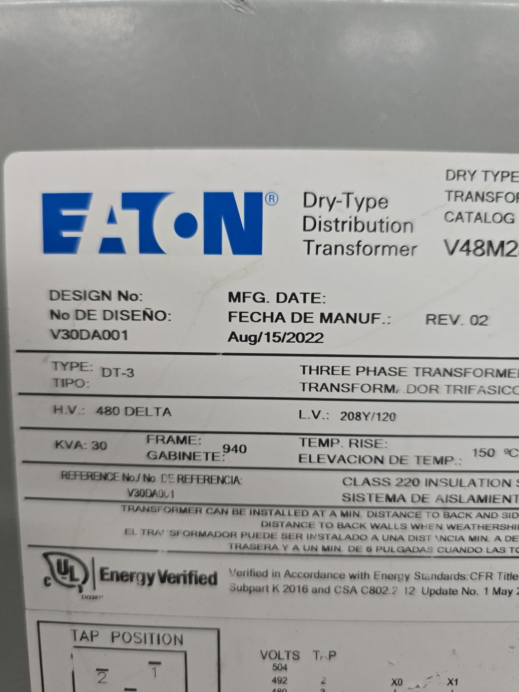 30kVA Eaton V48M28T3016 Transformer Pri 480V Sec 208/120V 3PH Indoor T275 G02S04