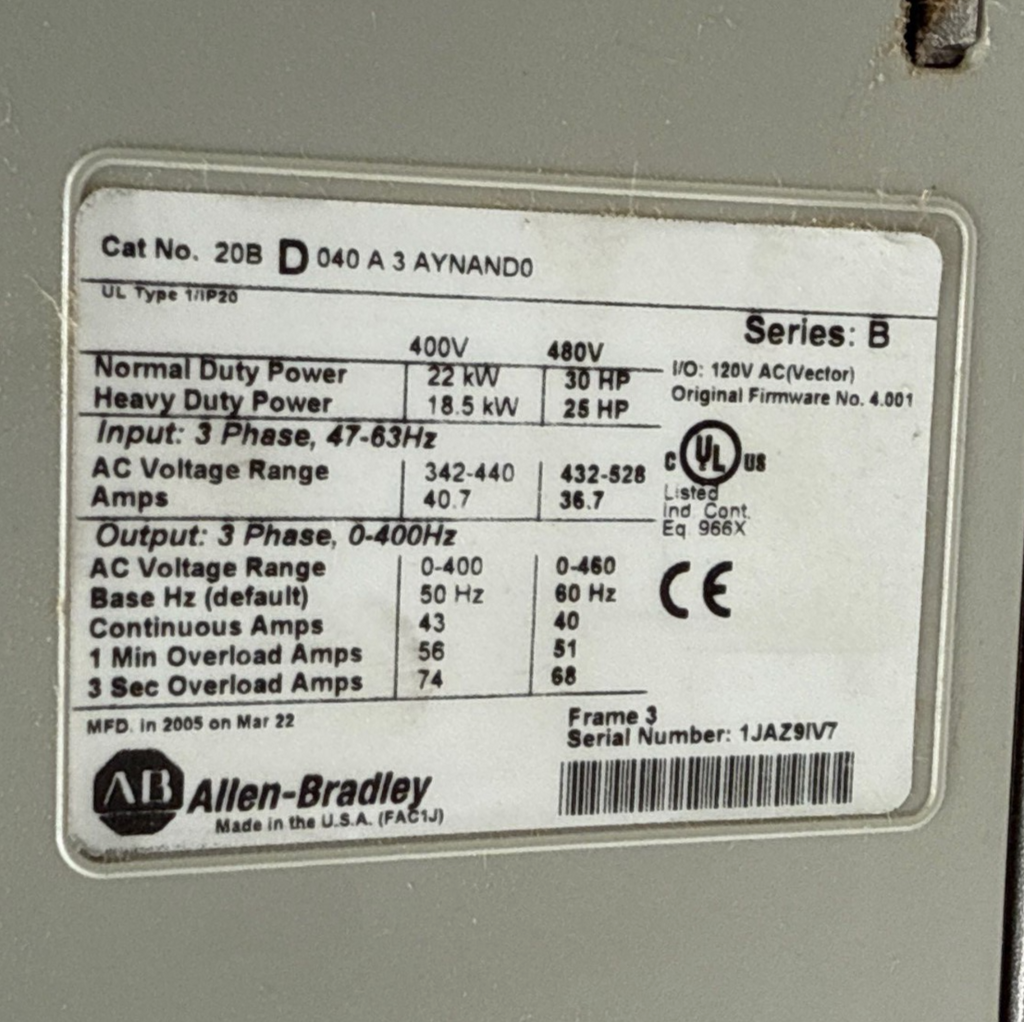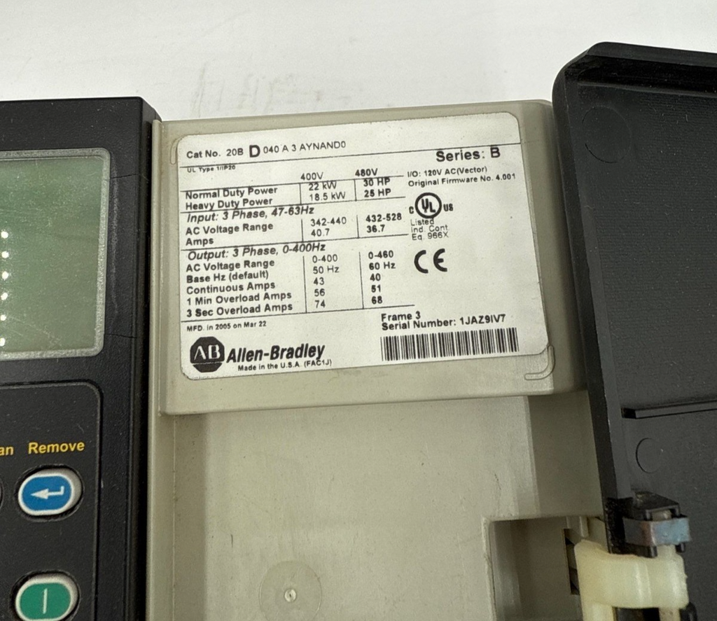Allen Bradley 20BD040A3AYNAND0 PowerFlex 700 AC Drive 30HP 22kW 480V 3PH 47-63Hz