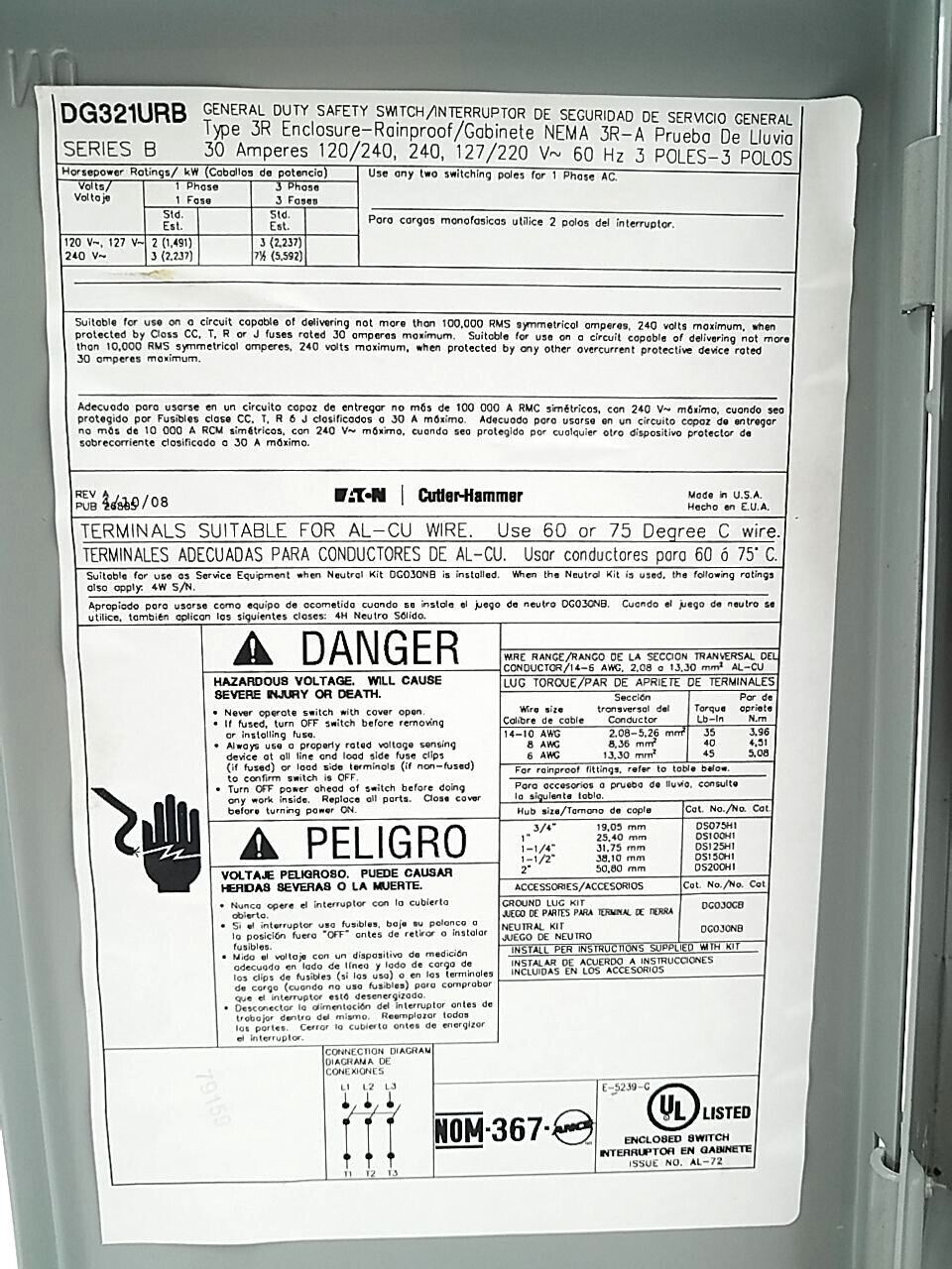 Eaton DG321URB Safety Disconnect Switch 30A 3P 240V 3PH 3R Encl Outdoor Recon 30 Amp 3 Pole