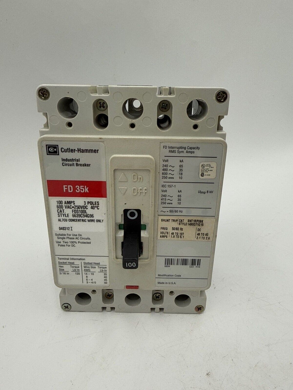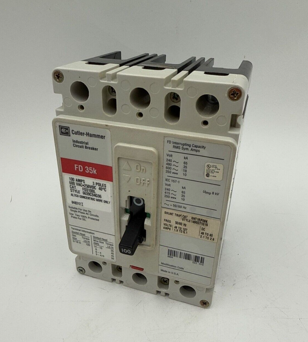 Cutler Hammer FD3100L Circuit Breaker 100A 3P 600V 3PH FD 35k 100 Amp 3 Pole