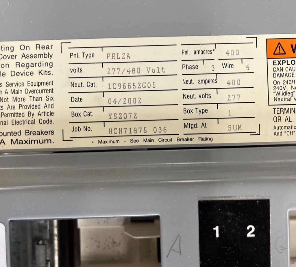 Cutler Hammer PRL2A Panelboard 400A 277/480V 3PH 4W Indoor Encl 42Cir MLO Subfeed Breaker: FD3225 Box YS2072: 72" x 20" x 6" P586