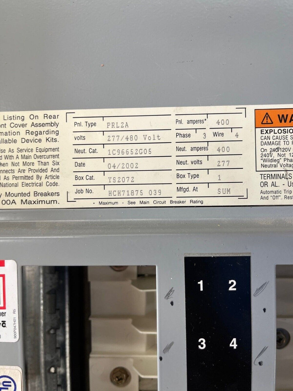 Cutler Hammer PRL2A Panelboard 400A 277/480V 3PH 4W 42Cir Indoor Encl FD3225 MLO P578 Used
