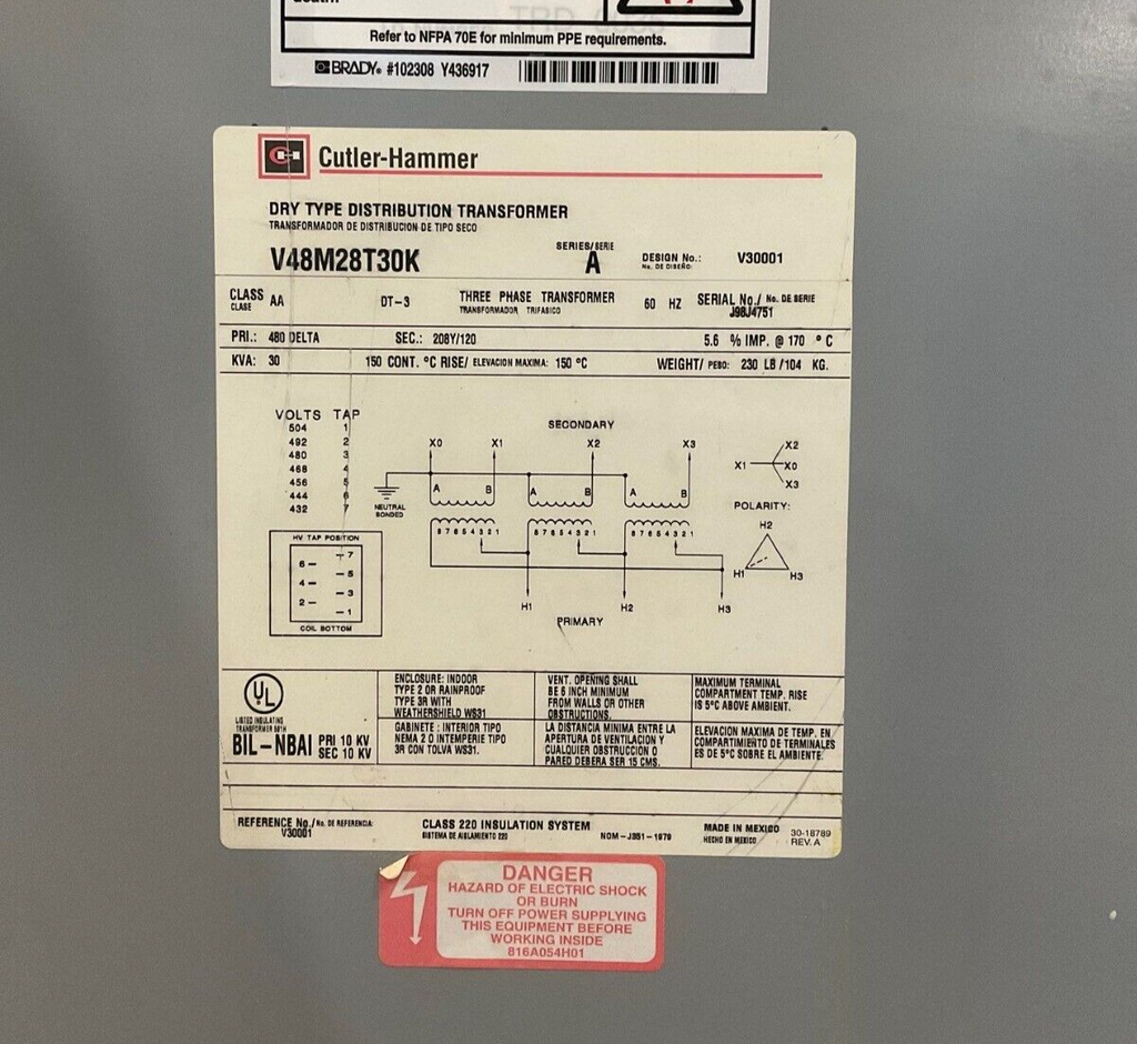 30kVA Cutler Hammer V48M28T30K Transformer Pri 480V Sec 208Y/120V 3PH Indoor Weight: 230lb