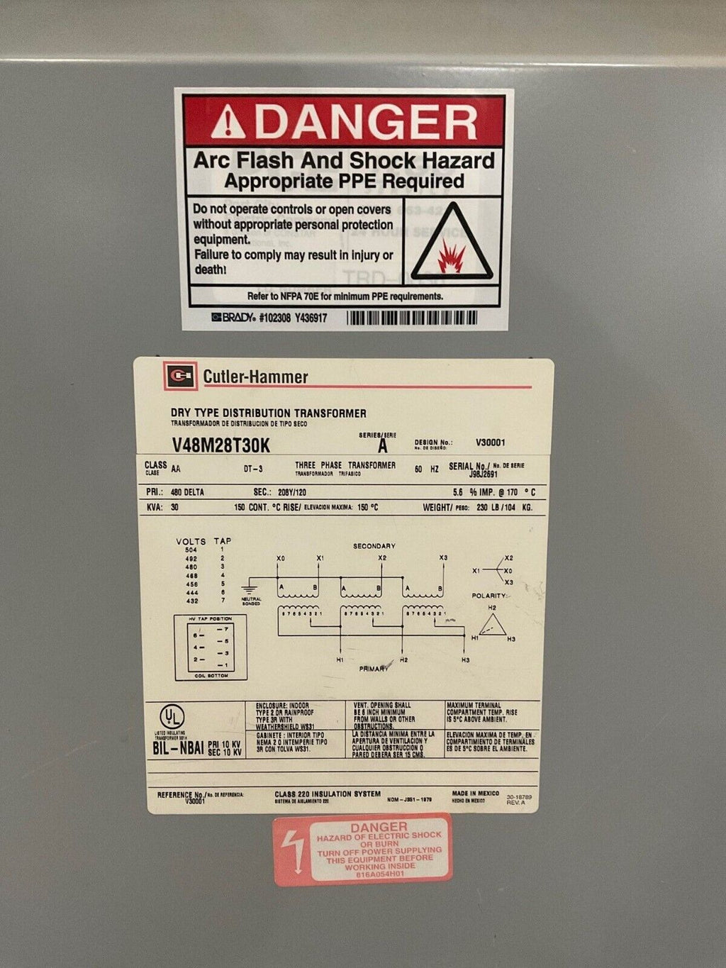 30kVA Cutler Hammer V48M28T30K Transformer 3PH Pri 480V Sec 208Y/120V Indoor Weight: 230lb
