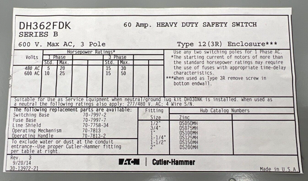 Eaton DH362FDK Safety Switch 60A 3P 600V Nema 12 Outdoor Enclosure