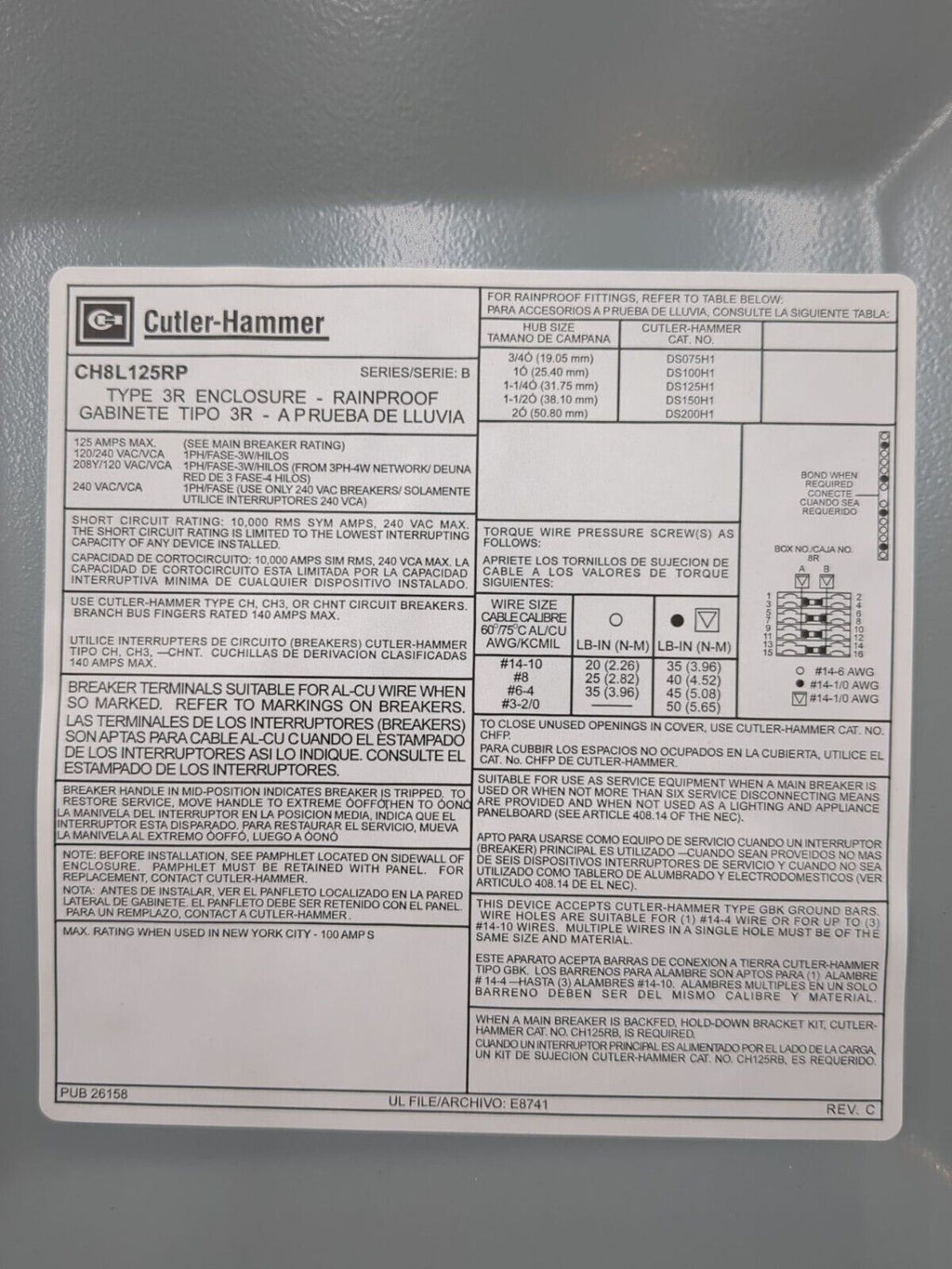 Eaton/Cutler-Hammer CH8L125RP, 125 Amp, 240V, Type 3R, 16 Circuit, Main Lug,