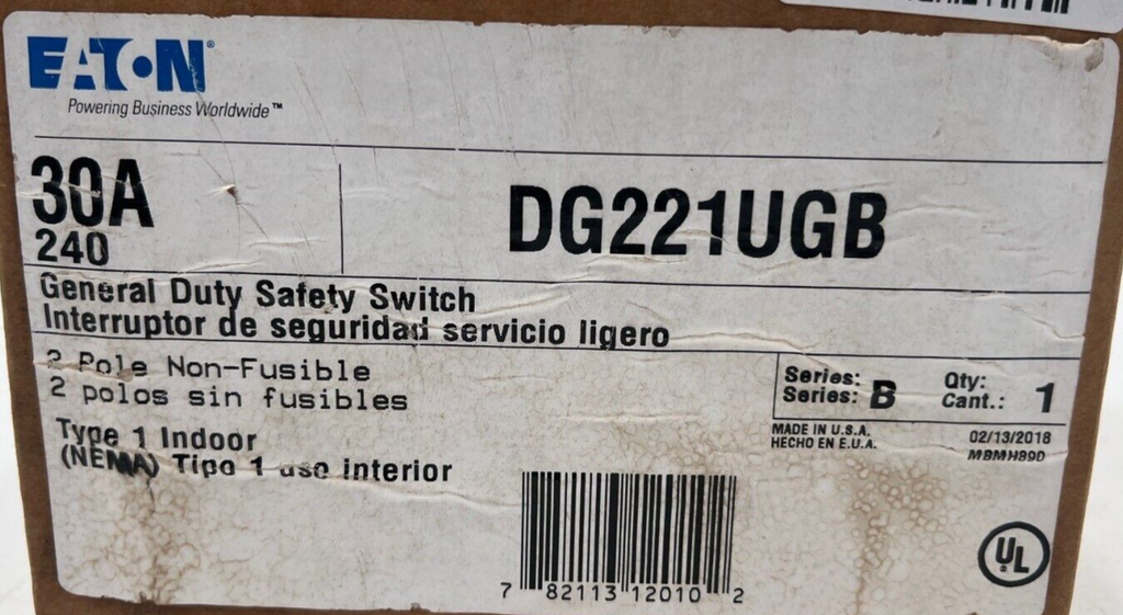 Eaton DG221UGB Safety Disconnect Switch 30A 2P 240V Type 1 Indoor Enclosure