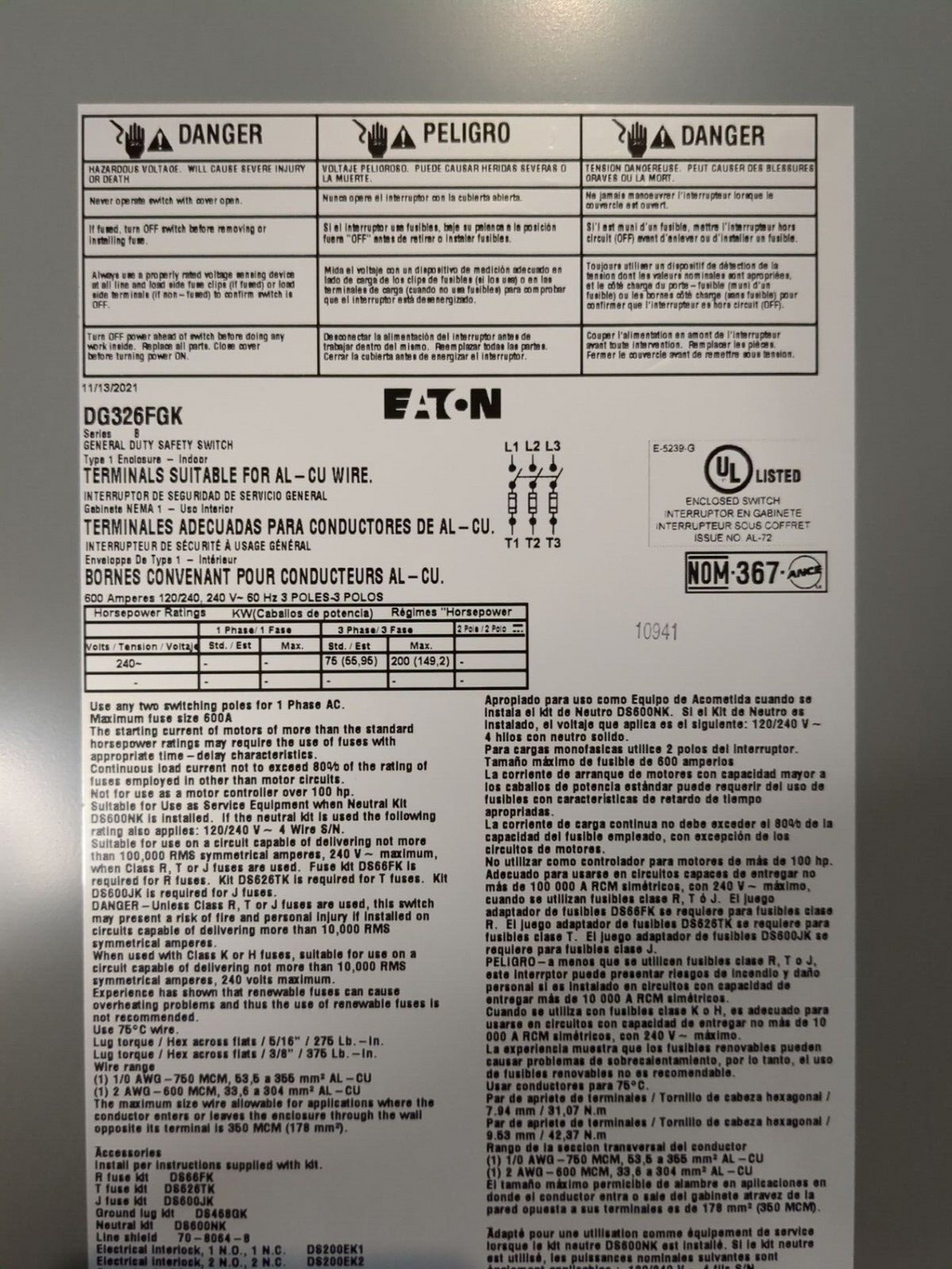 Eaton DG326FGK Safety Disconnect Switch 600A 3P 240V 3PH NEMA 1 Indoor Encl NOB
