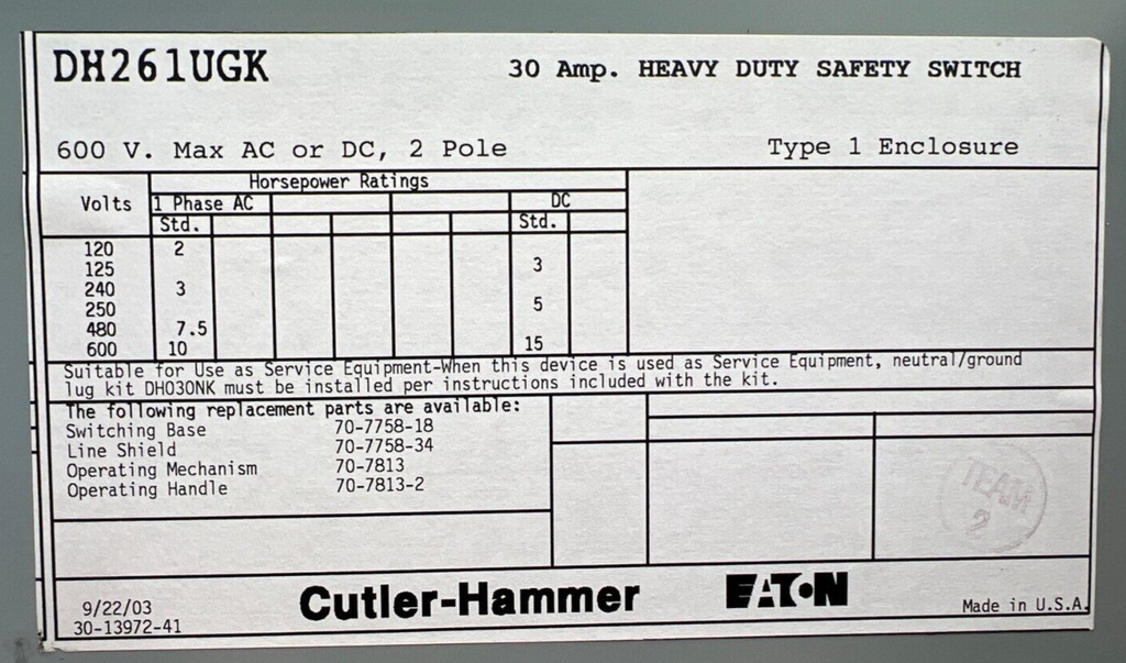 Eaton DH261UGK Safety Disconnect Switch 30A 2P 600V Type 1 Indoor Enclosure