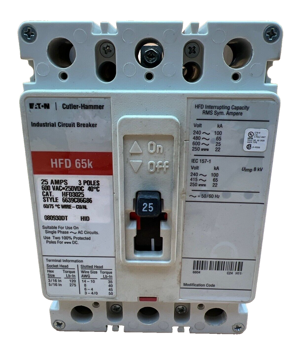 Eaton HFD3025 Circuit Breaker 25A 3P 600V 3PH Lug to Lug