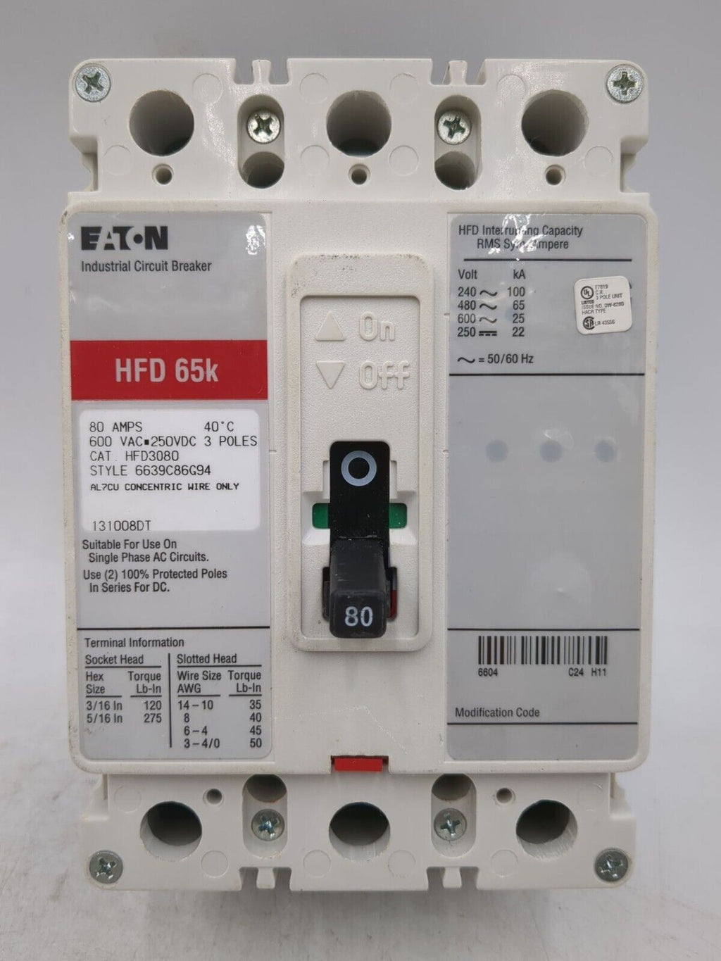 Eaton HFD3080 Circuit Breaker 80A 3P 600V 3PH HFD 65k 80 Amp 3 Pole