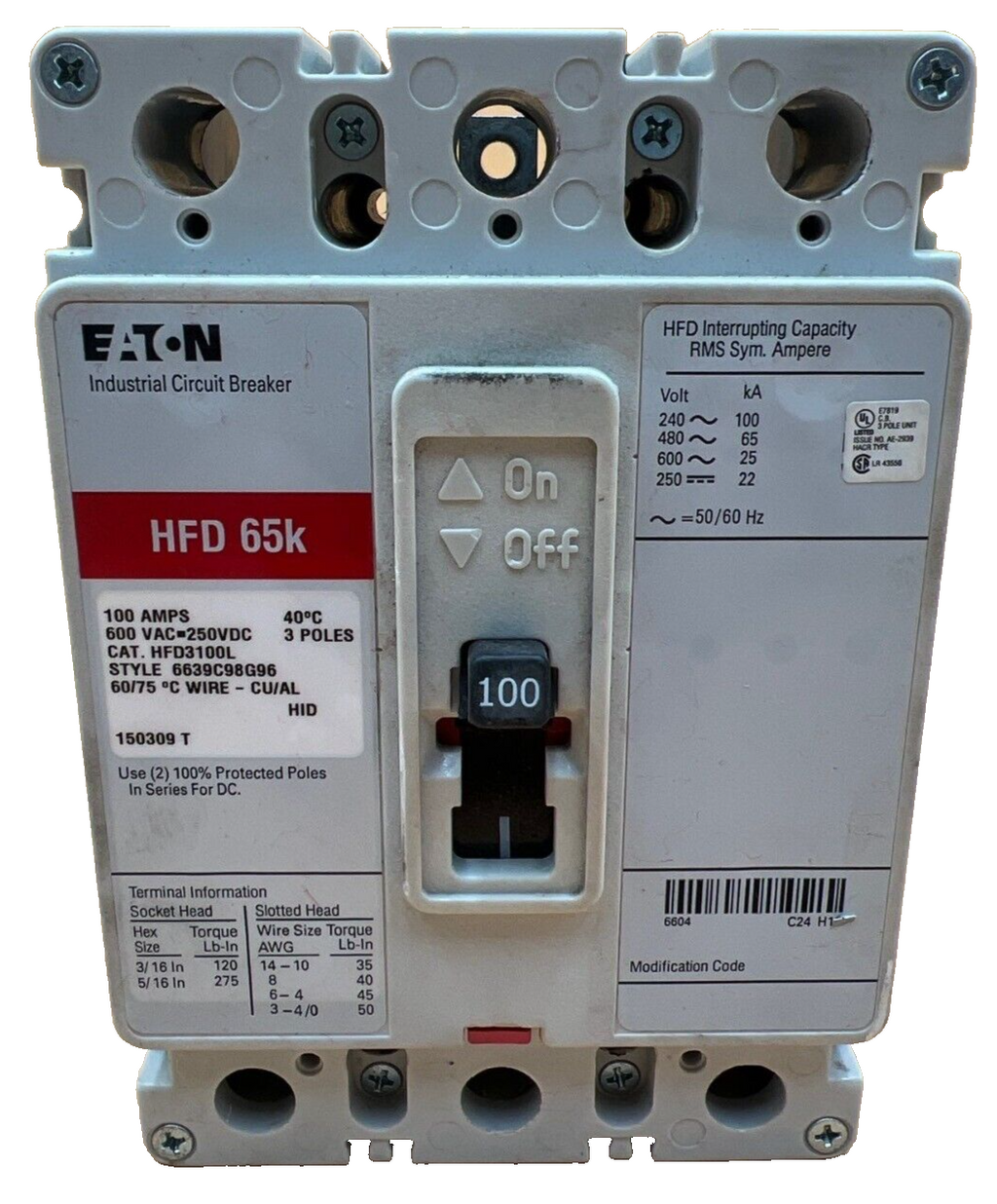 Eaton HFD3100L Circuit Breaker 100A 3P 600V 3PH HFD 65k 100 Amp 3 Pole
