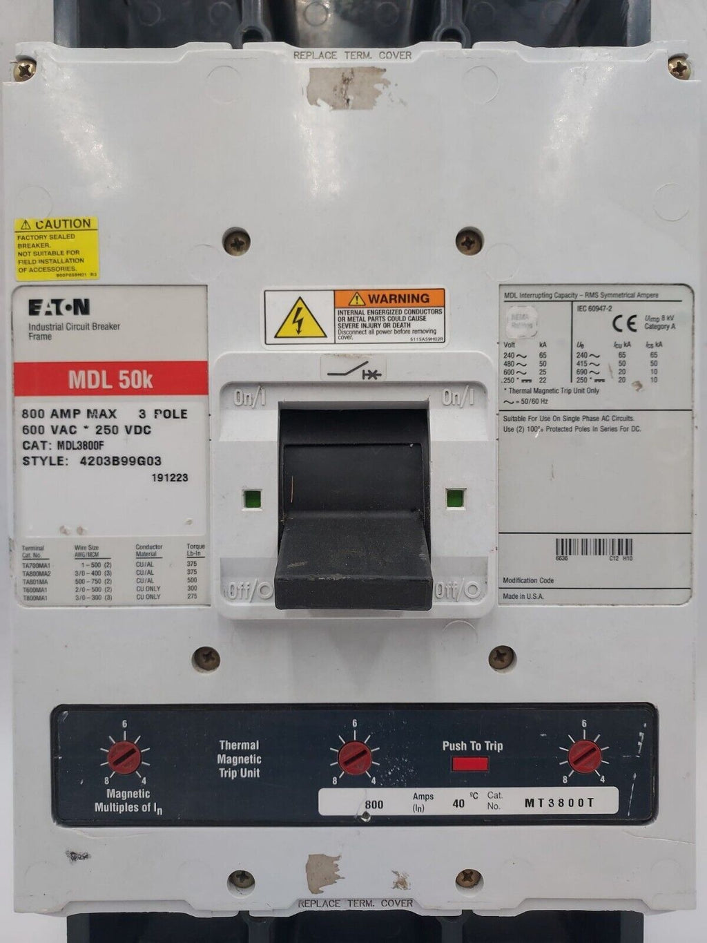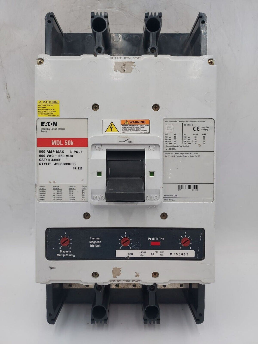 EATON Cutler Hammer MDL3800F Circuit Breaker 800A 3P 600V 3PH MDL3800 800 Amp 3 Pole BOLT ON