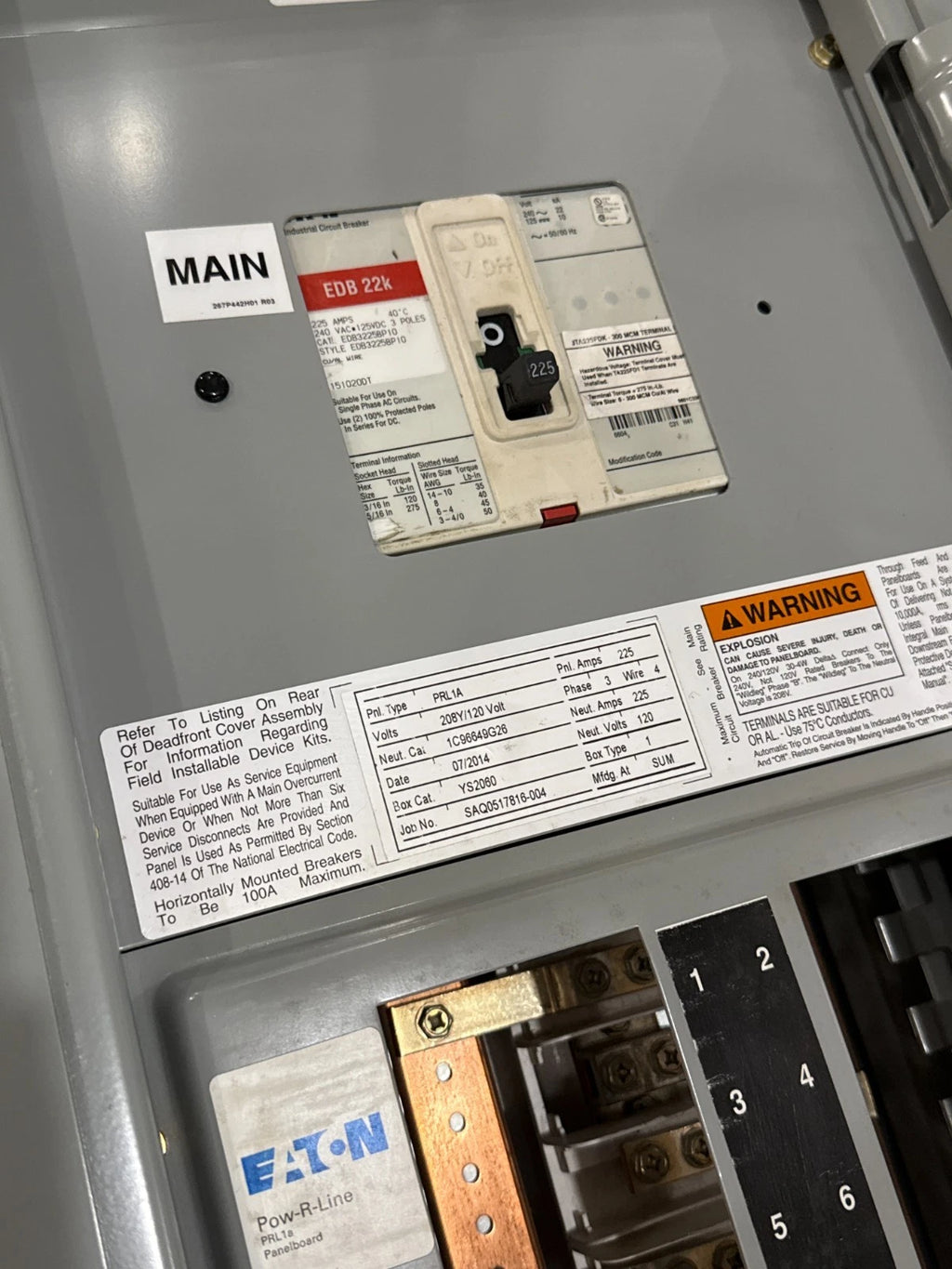 Eaton PRL1A Panelboard 225A 208/120V 3PH 4W MCB Panel 225 Amp 60 Circuit