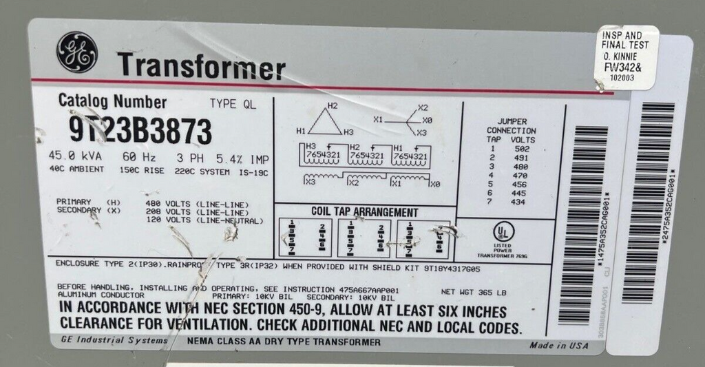 45KVA GE 9T23B3873 Transformer Pri 480V Sec 208/120V 3 Phase Indoor 3PH 60Hz Weight: 304lb