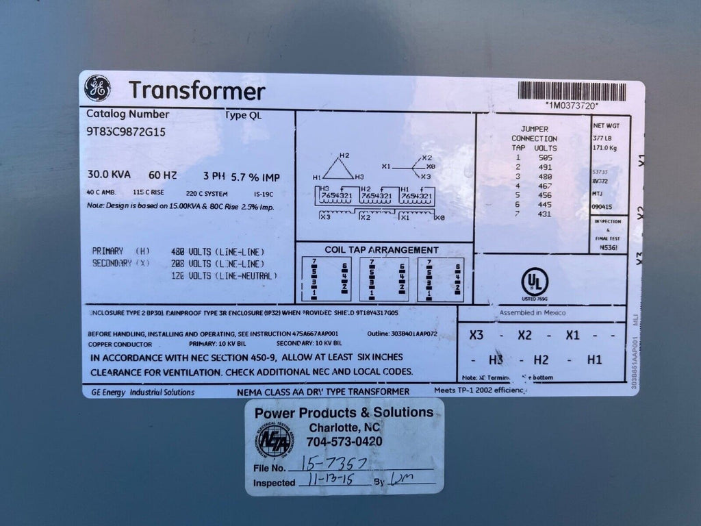 30KVA GE 9T83C9872G15 Transformer Pri 480V Sec 208/120V 3PH 3R Encl