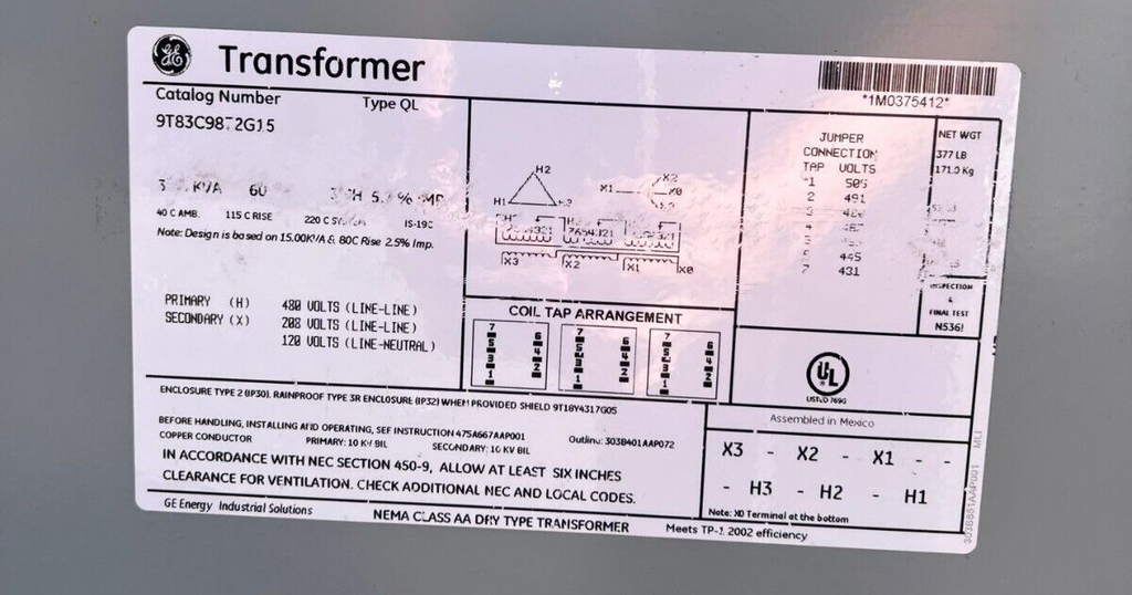 30 KVA GE General Electric 9T83C9872G15 Transformer Pri 480V Sec 208/120V 3 Phase 3R Encl Outdoor Weight: 377 lb