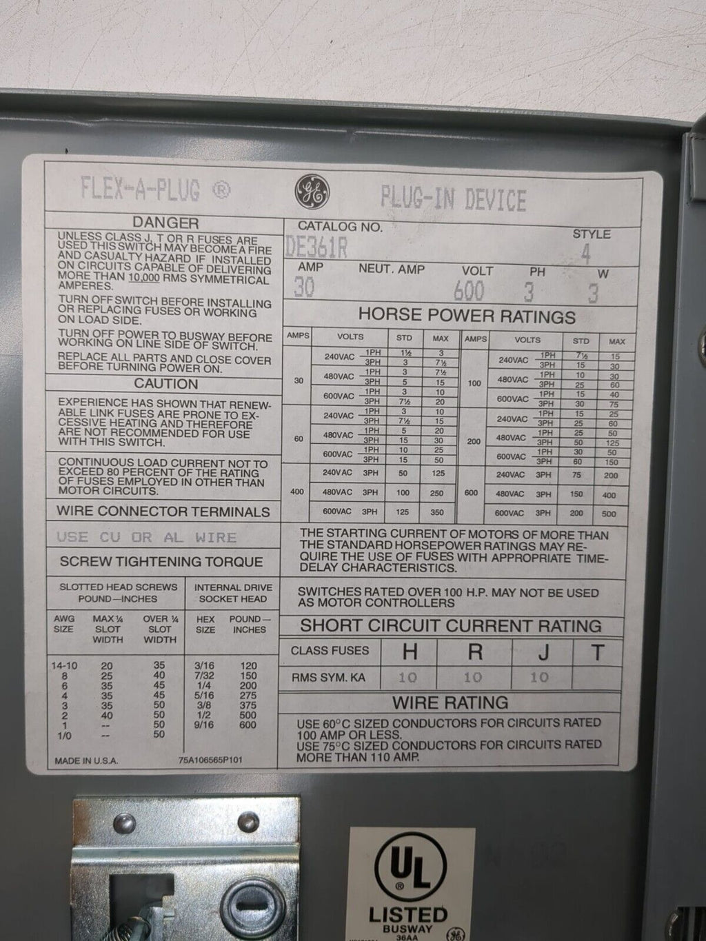General Electric DE361R, 30 Amp, 600 Volt, 3 Phase, Busway Plug NOB