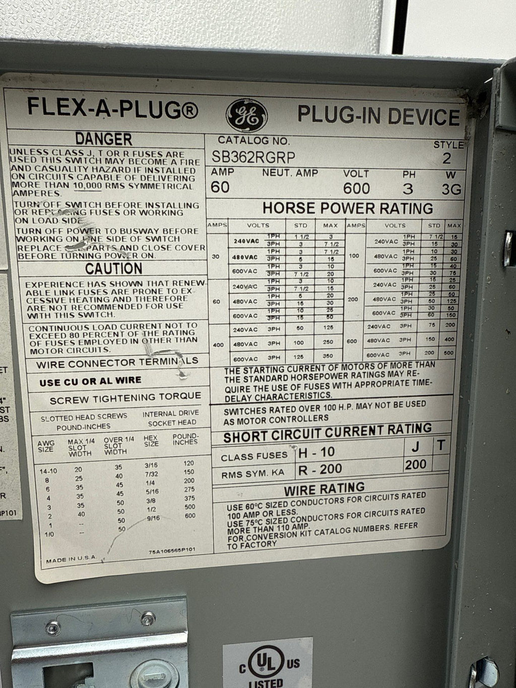 GE SB362RGRP Bus Plug 60A 3PH 3W 600V Spectra Series Busway Switch Flex A Plug60 Amp 3 Pole Plug In Device Style 2