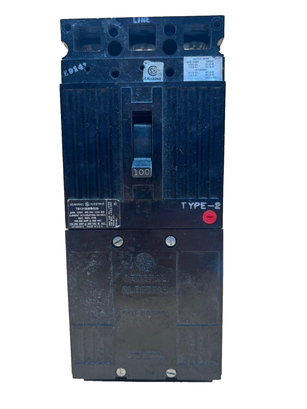 General Electric TB13100BWE09 100A 480V 3P Lug to Lug Circuit Breaker