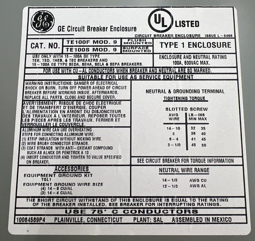 GE TE100S Safety Disconnect Switch 100A 3P 600V Type 1 Indoor Enclosure