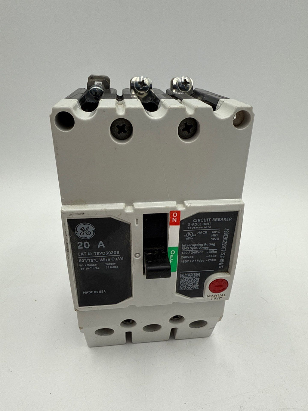 General Electric GE TEYD3020B Circuit Breaker 20A 3P 480/277V 3PH TEYD 20 Amp 3 Pole Bolt On