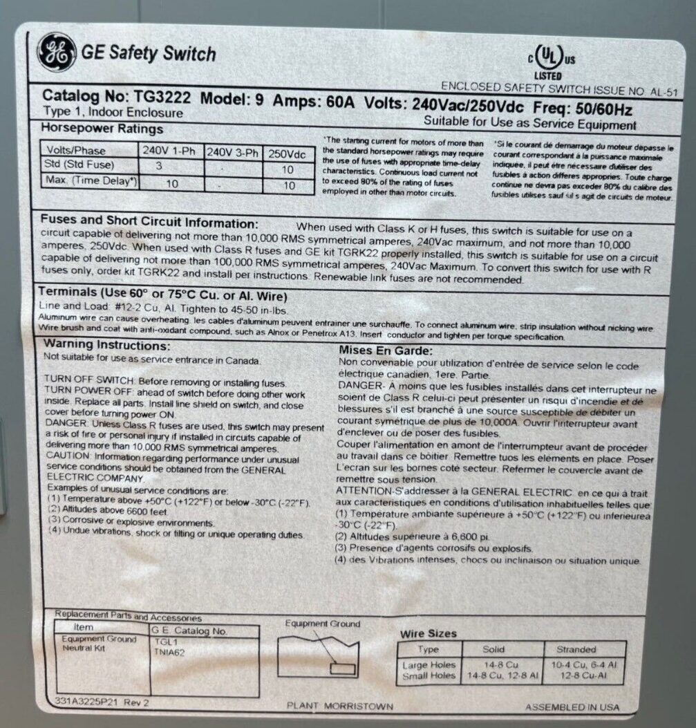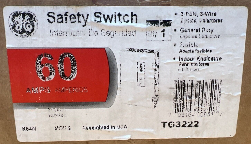 GE TG3222 Safety Disconnect Switch 60A 2P 240V Type 1 Enclosure