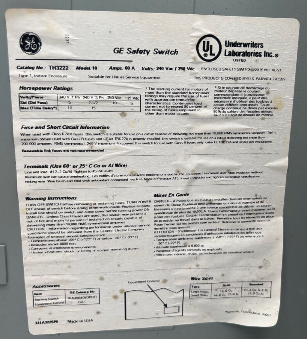 GE TH3222 Safety Disconnect Switch 60A 2P 240V Type 1 Enclosure