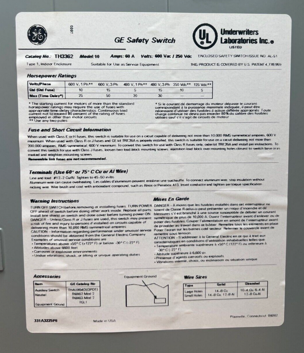 GE TH3362 Safety Disconnect Switch 60A 3P 600V Type 1 Indoor Enclosure