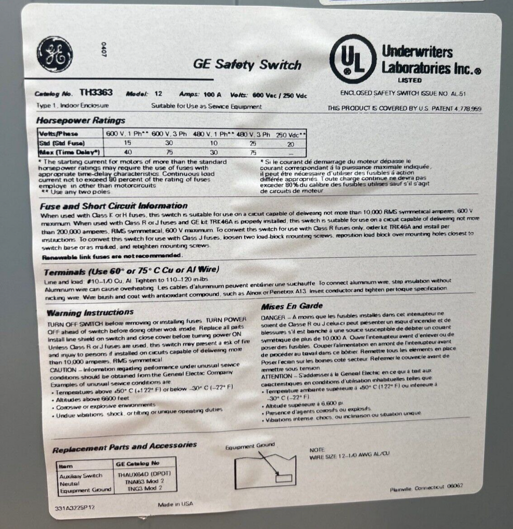 GE TH3363 Safety Disconnect Safety 100A 3P 600V 3PH NEMA 1 Indoor Fusible