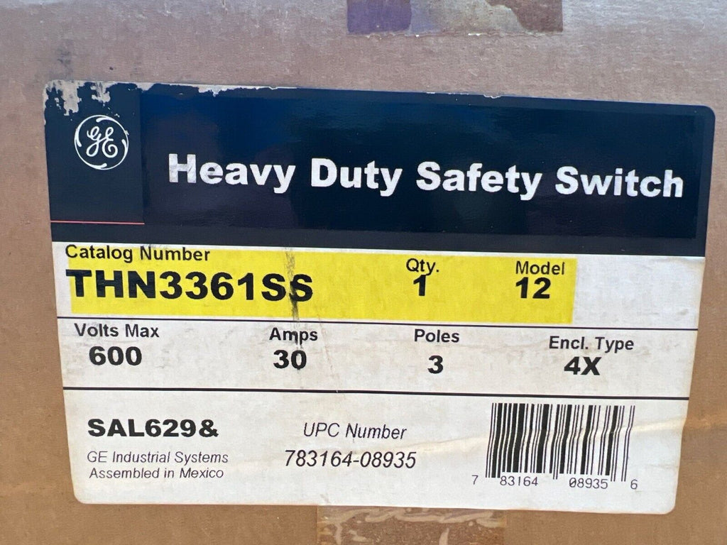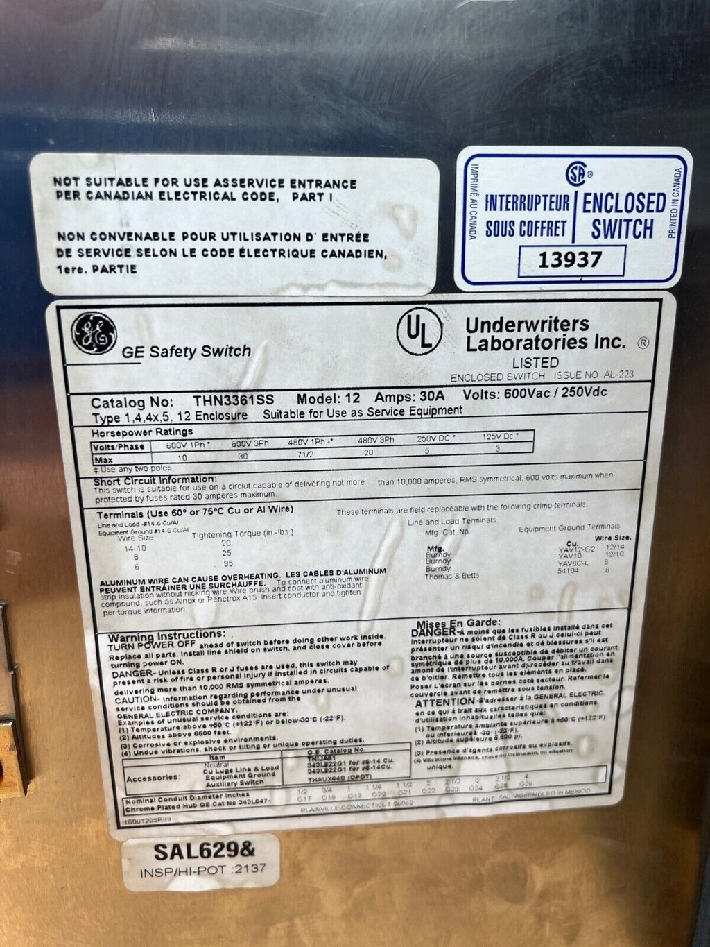 GE THN3361SS Safety Disconnect Switch 30A 3P 600V 4X Outdoor Enclosure