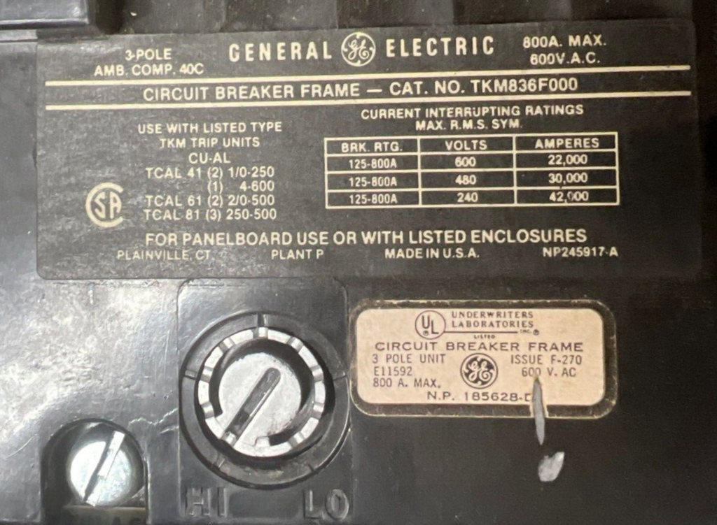 GE TKM836800 TKM836F000 Lug to Lug Circuit Breaker 800A 3P 600V 3PH