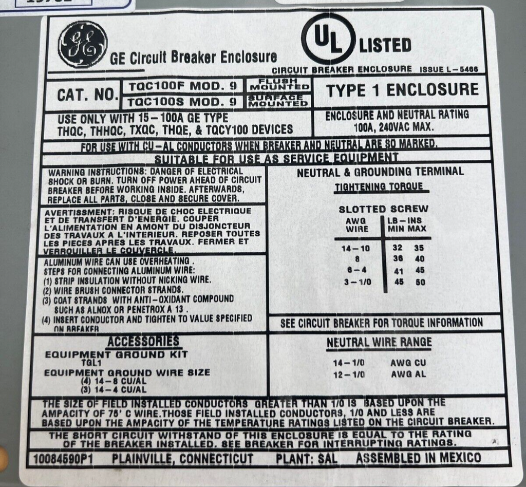 GE TQC100S 100A 240V Circuit Breaker Enclosure Type 1