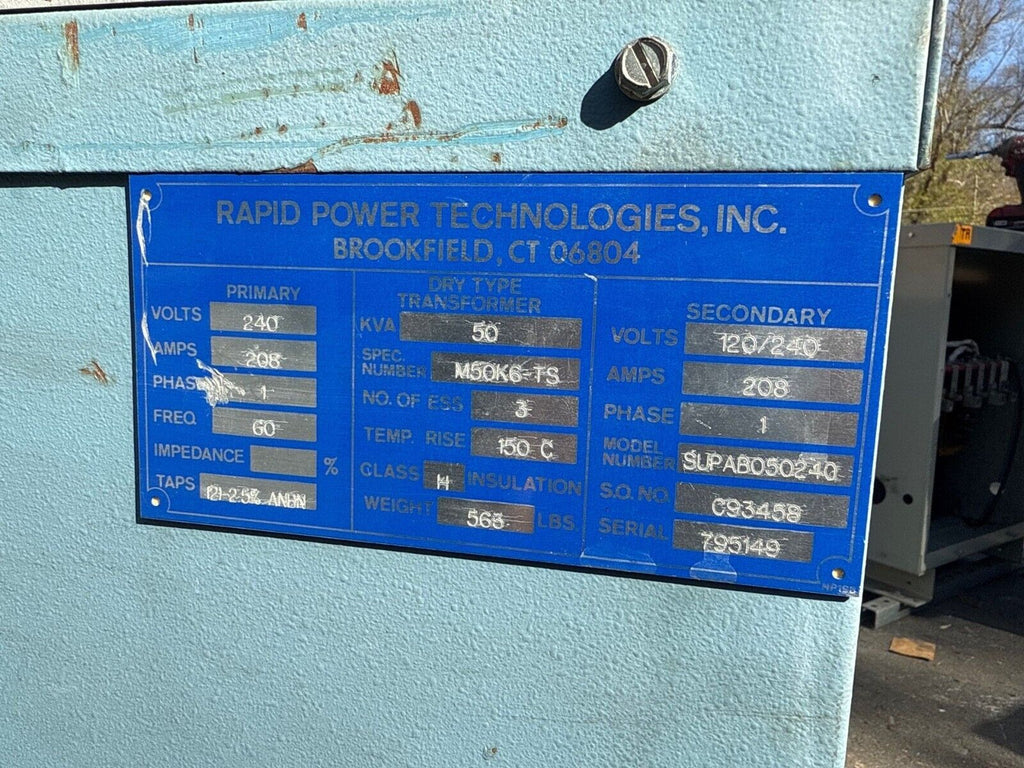 50KVA Rapid Power M50K6-TS Transformer Pri 240V Sec 120/240V 1PH Indoor Encl Weight: 565lb T221