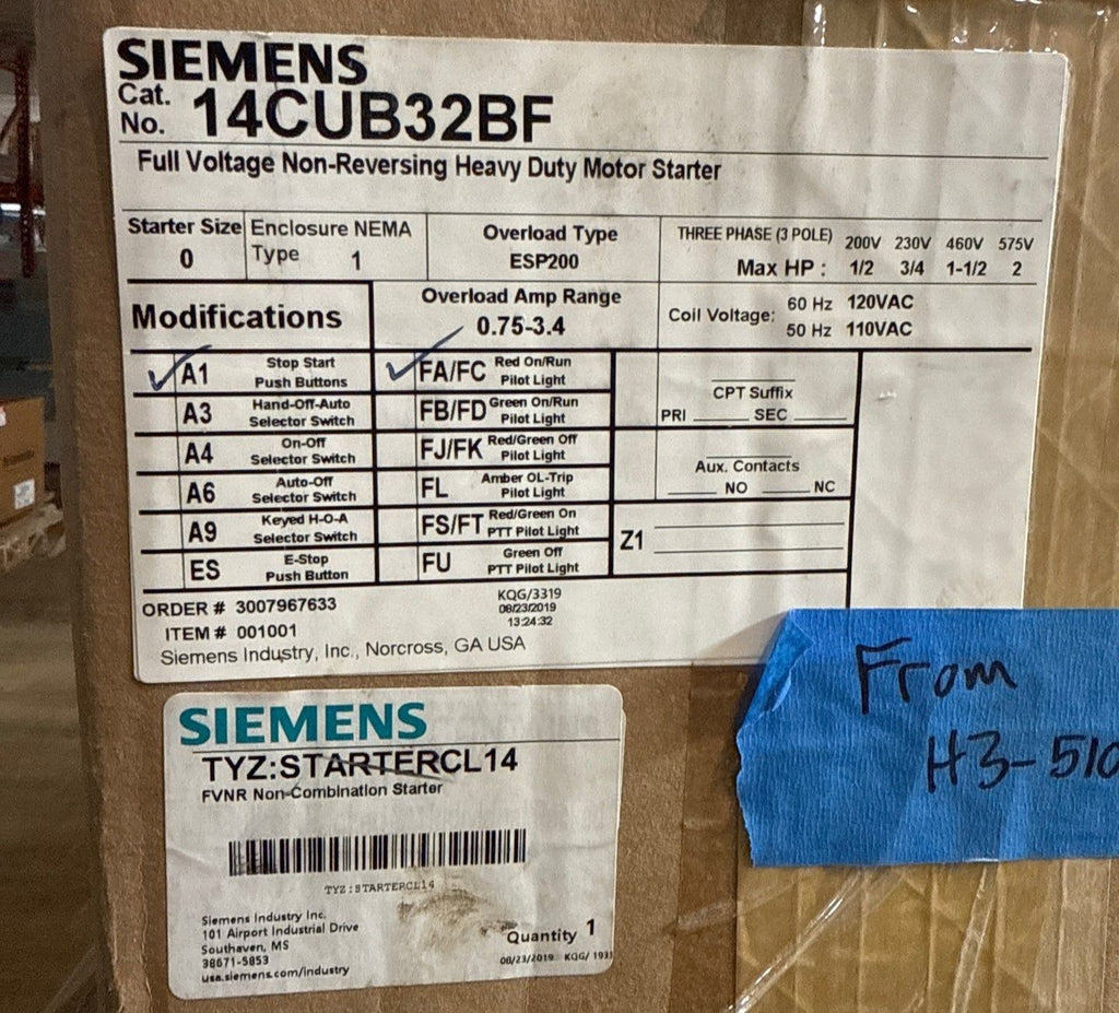 Siemens 14CUB32BF Heavy Duty Motor Starter 2HP Max 120V Coil 0.75-3.4A