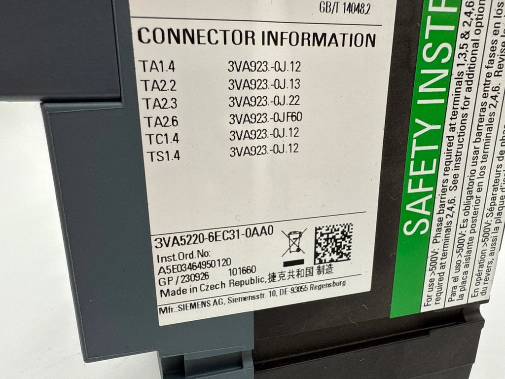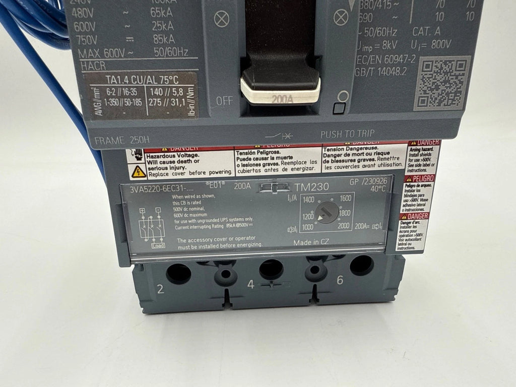 Siemens 3VA5220-6EC31-0AA0 Circuit Breaker 200A 3P 600V 3VA52 200 Amp 3 Pole Shunt Trip 3VA9978-0BL32